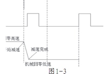 當No.6號參數的第0位和第1位均設為1時,狀態參數No.005號參數的第5位為0時,減速信號低電平有效,為方式C回零,方式C回機械零點時序圖如下1-4: