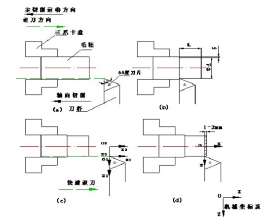 在工件坐標系建立之前, 還要考慮到車刀安裝后刀尖中心是否處于軸心位置的, 因此, 單把車刀的對刀包括:刀尖中心的高度調整和工件坐標系的建立兩個過程.
