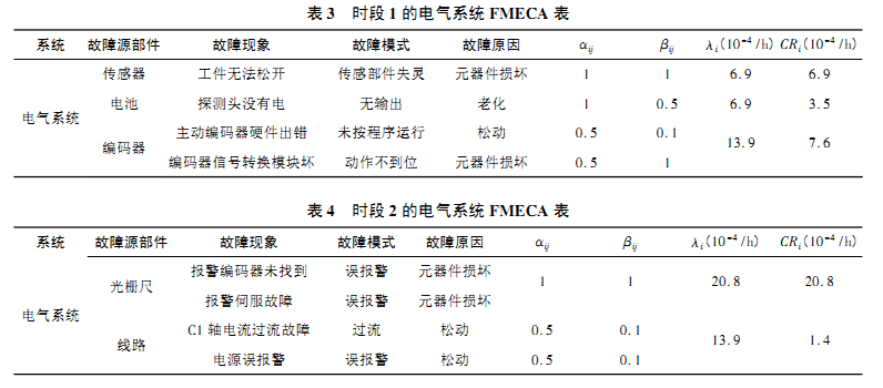 通過FMECA分析表能夠直觀地分析出哪種故障對 生產(chǎn)的危害度最大。由表3得出,時段1時的編碼器危害 度大于其他2項(xiàng),是加工中心在時段1時最應(yīng)該加以防護(hù) 的危害。在時段2時,光柵尺危害度達(dá)到了 20. 8,是整個 系統(tǒng)中危害度最大的一項(xiàng),而且都是因?yàn)楣鈻懦邠p壞造成 的,在日常維修工作中還需改善光柵尺選型及定期清理等 相關(guān)工作。從時段1和時段2的FMECA分析表中得出,2 個故障器的電氣系統(tǒng)常見故障危害度并不相同,這是因?yàn)?加工中心在不同的時間段里會表現(xiàn)出不同的故障,所以, 對加工中心不同故障時期的研究是有著重要的現(xiàn)實(shí)意義 及實(shí)用價值的。