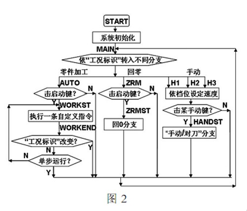 圖 3 為主控軟件框圖 圖 3 考慮了多指令共段和共段指令執(zhí)行順序 TST 分支實現(xiàn)除 T00 指令外全部 T 指令的功能 M1S 分支實現(xiàn) 了 M03 M04 M06 M97 M98 M99 M21 M22 M23 M24 M25M26 M27 M28 等指令的功能 M2S 分支實現(xiàn)了 M00,M02,M05,M30,M20 等指令的功能 也考慮了模態(tài)指令的處理
