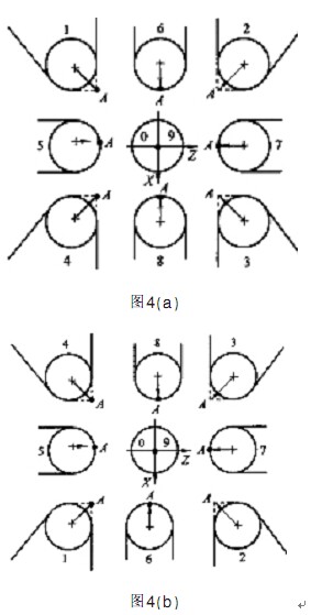 根據(jù)車刀的形狀確定位置參數(shù),數(shù)控車削使用的刀具有很多種,不同類型的車刀其刀尖圓弧所處的位置不同,如圖所示〔)將車刀的形狀和位置用刀尖方位參數(shù)T來表示,A點(diǎn)為假象的刀尖點(diǎn),刀尖方位參數(shù)共有8個(gè)(n -g) >當(dāng)使用刀尖圓弧中心編程時(shí),可以選用?;?/span>9})圖(a)為刀架前置的數(shù)控車床假象刀尖的位置;圖((b)為刀架后置的數(shù)控車床假象刀尖的位置、