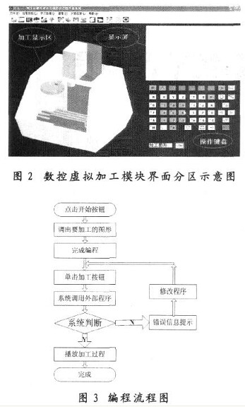數控虛擬加工模塊界面分為三個區域,分別為數控加工顯示區,編程操作鍵盤和程序顯示屏,如圖2所示。單擊編程開始按鈕“M”,程序顯示屏顯示程序名,即可以進行數控編程,其工作方式按圖3流程圖進行。