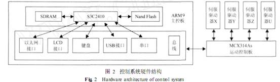 體系硬件渠道由 ARM9的 S3C2410主控板和 MCX314As運動控制板構成 ,這樣分隔規劃有利于使整個數控體系的硬件體系結構及各個模塊的接口模塊化和標準化。為將來模塊或許體系的硬件維護和升級帶來極大的方便。