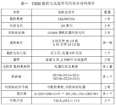 C630 數控化改造所用的部分材料清單如表一所示 僅供參考具體使用情況根據現實情況采用