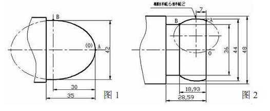如圖2 所示零件,該零件編程時(shí)以其右端中心 O 點(diǎn)作為編程原點(diǎn),此例如用橢圓極坐標(biāo)方程,則要分別計(jì)算出 A和B點(diǎn)處的橢圓極角,很麻煩 從零件圖給出的尺寸可知 A點(diǎn)對(duì)應(yīng)的橢圓長軸值為 7mm, B 點(diǎn)對(duì)應(yīng)的橢圓長值為 11.93 mm(18.93- 7=11.93),因此我們可以將橢圓長軸設(shè)為自變量,數(shù)值由 A點(diǎn)的 7mm 逐漸減少到 B 點(diǎn)的- 11.93mm,然后根據(jù)橢圓直角坐標(biāo)標(biāo)準(zhǔn)方程,求得所對(duì)應(yīng)的短軸變化值,最后再算出橢圓 AB 段每個(gè)點(diǎn)在工件坐標(biāo)系中對(duì)應(yīng)的X值和 Z值,從而加工出該零件的橢圓部分 編程中采用循環(huán)(WHILE)語句
