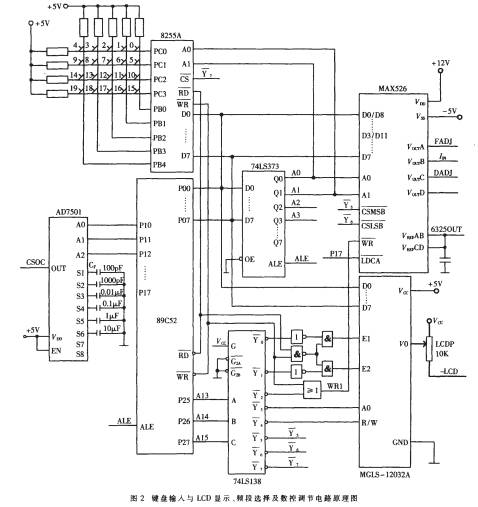 數(shù)字化波形發(fā)生器主要由主控制器單片機(jī) 89C52、鍵盤(pán)與顯示電路、波形發(fā)生器 MAX038、 12 位 4 路數(shù)模轉(zhuǎn)換器 MAX526、頻段控制單元、幅值控制單元等單元電 路 組 成 。 單 片 機(jī) 主 要 完 成 對(duì) 鍵 盤(pán) 輸 入 的 檢 測(cè) 、對(duì)MAX038 輸出波形的選擇、 對(duì) D/A 輸出控制, 從而完成對(duì)頻率和占空比的調(diào)節(jié)及對(duì)頻段的選擇; 鍵盤(pán)采用 4× 5的矩陣鍵盤(pán), 分別設(shè)置了數(shù)字鍵( 0~9) 和功能鍵( 小數(shù)點(diǎn)" ."、 頻段、 頻率、 占空比、 幅值、 正弦波、 方波、 三角波、取消等) 共 19 個(gè)鍵。使用時(shí)先按功能鍵后按數(shù)字鍵; 顯示部分采用 LCD 顯示頻率(6 位)和幅值(4 位); MAX038函數(shù)發(fā)生器芯片是系統(tǒng)的核心部分, 在單片機(jī)的控制下輸出正弦波、 三角波、 矩形波, 且波形的頻率和占空比易于調(diào)節(jié); 12 位 4 路輸出的數(shù)模轉(zhuǎn)換器 MAX526 在單片機(jī)的控制下, 輸出 2~750μ A 的電流及± 2.4V 和± 2.3V 的電壓, 分別進(jìn)行頻率、 占空比的調(diào)節(jié); 頻段選擇單元采用 8選 1 的多路模擬開(kāi)關(guān) AD7501, 在單片機(jī)的控制下使每一路分時(shí)選通, 將不同的電容值 CF 接入 MAX038 電路中, 就可確定輸出頻率范圍, 即頻段, 共有 6 個(gè)頻段供選擇切換, 輸出波形頻率范圍與 CF 的關(guān)系如表 1 所示。幅度控制單元主要調(diào)節(jié)輸出信號(hào)的幅度, MAX038 輸出端OUT 的 VP - P =2V 幅度值通過(guò)放大器放大后送入數(shù)字衰減器 AT- 280 中進(jìn)行衰減, 調(diào)整放大后的輸出幅度。鍵盤(pán)輸入與顯示、 頻段選擇及數(shù)控調(diào)節(jié)電路原理圖如圖 2所示。