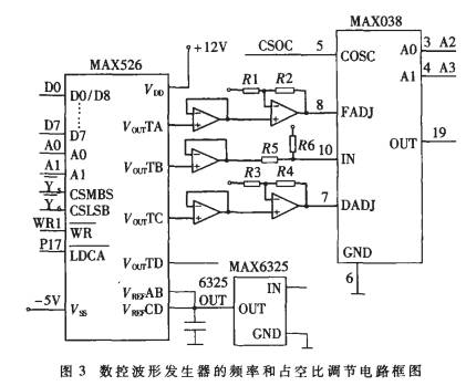 MAX038 的輸出頻率主要受振蕩器電容 CF、 IIN 端電流 IIN 和 FADJ 端電壓 VFADJ 控制。選擇一個(gè) CF 值, 對(duì)應(yīng)IIN 端電流變化, 將產(chǎn)生一定范圍的輸出頻率。另外, 改變 FADJ 端的電壓, 可以在 IIN 控制的基礎(chǔ)上, 對(duì)輸出頻率實(shí)現(xiàn)微調(diào)控制。 可通過(guò)電壓輸出型的 DAC MAX526 實(shí)現(xiàn)輸出頻率的數(shù)控調(diào)節(jié)。MAX038 的 IIN 端和 FADJ 端分別連接到 MAX526 的 VOUTA 和 VOUTB 兩個(gè)輸出端上。通過(guò) V B 產(chǎn)生 0V( 00H) 到2.5V( 0FFH) 的輸出電壓, 再經(jīng)電壓/電流轉(zhuǎn)換網(wǎng)絡(luò), 在 IIN 端產(chǎn)生 0μ A 到 750μ A 的工作電流, 使之產(chǎn)生相應(yīng)的頻率范圍。VOUTB 將此工作電流范圍分為 256 級(jí)步進(jìn)間隔, 輸出頻率范圍也被分為 256級(jí)步進(jìn)間隔。所以, IIN 端電流實(shí)現(xiàn)了對(duì)輸出頻率的粗調(diào)。VOUTA 在 FADJ 端產(chǎn)生一個(gè)從- 2.4V( 00H) 到+2.4V( 0FFH) 的電壓范圍, 該范圍同樣也包含 256 級(jí)步進(jìn)間隔, 將 IIN 端的步進(jìn)間隔再次細(xì)分為 256 級(jí)步進(jìn)間隔,從而在粗調(diào)的基礎(chǔ)上實(shí)現(xiàn)微調(diào)。各頻段的頻率范圍劃分為 65 536 級(jí)間隔。 MAX526 的 VOUTC 在 DADJ 端產(chǎn)生一個(gè)從- 2.3V( 00H) 到+2.3V( 0FFH) 的 電壓 調(diào)節(jié)范 圍, 對(duì) 占空比實(shí)現(xiàn)數(shù)字控制, 該范圍包含 256 級(jí)步進(jìn)間隔。VOUTC的每一級(jí)步進(jìn)對(duì)應(yīng)著 Δ V=[2.3- ( - 2.3) ]/256=17.9mV 和V%=( 90%- 10%) /256=0.3125。調(diào)節(jié)占空比時(shí)應(yīng)盡量避免輸出頻率發(fā)生變化。僅當(dāng) δ =15%~85%且 25μ A<IIN<250μ A 時(shí), 對(duì)頻率影響最小。數(shù)控波形發(fā)生器頻率和占空比調(diào)節(jié)電路的原理圖如圖 3 所示。