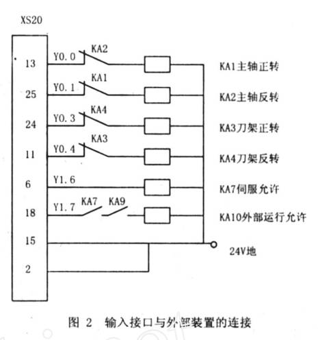 數控車床的主傳動需求較寬的調速規模和滿意的輸出力矩.依據機床需求保存原車床主軸變速箱 , 內嵌 PLC經過輸出開關量接口 XS20中的 Y010 和 Y011 , 別離操控主軸電機的正、回轉中心繼電器 KA1和 KA2 (KA1和 KA2連有硬件互鎖) , 電氣銜接圖見圖2 (見88頁) . 選用機械換檔辦法完結主軸有級調速 , 為使改造后的車床具有主動加工螺紋功用 , 在主軸電動機結尾設備 1024 線的增量式光電編碼器 , 使其轉速與主軸轉速共同 , 即主軸轉1周 , 光電編碼器隨之轉1周. 光電編碼器發生的速度、方向信號以脈沖辦法由 XS9主軸操控接口發給數控體系 , 數控體系依據主軸的脈沖信號操控步進驅動設備宣布斷定的脈沖信號 , 使刀架經過絲杠的轉向發生進給運動 , 操控進給軸與主軸同步 , 然后加工出所需的螺紋.