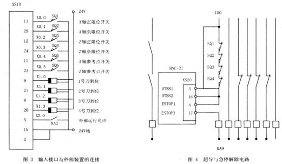 別離是設備于機床 X、Z軸超程行程開關的常閉觸點 , KA9是急停中心繼電器 , OTBS1和 OTBS2經過 XS20接口與機床操作面板的按鍵相連 , ESTOP1和 ESTOP2與急停按鈕相連. 當移動設備碰到超程開關時 , KA9 線圈失電 , 使圖 2 中運轉允許繼電器 KA10線圈失電 , 然后主動堵截移動設備的動力電源. 圖3中的 SQ1(SQ3)和 SQ2(SQ4)是超程開關的常開觸點 , 經過數控設備輸入量接口 XS10與 PLC的 X010、X011、X012和 X013輸入點銜接 , 向體系宣布超程報警信息.