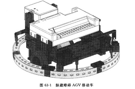 躲避障礙AGV移動車見圖63-1,能夠在前方遇到障礙時自動躲避并改變前進方向。躲避障礙AGV移動車由行走機構(gòu)、障礙檢測裝置、智能接口板和電源組成。該AGV移動車使用下列輸人輸出設(shè)備:2個電動機,用于控制移動車左右車輪的運轉(zhuǎn),控制移動車的行走;2個按鈕開關(guān)與凸輪配合作為旋轉(zhuǎn)編碼器使用產(chǎn)生脈沖信號,分別控制所對應(yīng)左右車輪轉(zhuǎn)速;在移動車左前方、右前方和正后方裝有限位開關(guān),用于檢測障礙物的方向,并發(fā)出信號。行走機構(gòu)由兩個主動輪和一個無動力的輔助輪組成,均安裝在車架上。電源和智能接口板安裝在車架上部。