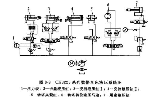 液壓變速機構在數(shù)控機床上得到普遍使用。圖8-9為一個典型液壓變速機構的原理圖。三個液壓缸都是差動液壓缸,用Y型三位四通電磁閥來控制。滑移齒輪的拔叉與變速液壓缸的活塞桿連接。當液壓缸左腔進油右腔回油、右腔進油左腔回油或左右兩腔同時進油時,可使滑移齒輪獲得左、右、中三個位置,達到預定的齒輪嚙合狀態(tài)。在自動變速時,為了使齒輪不發(fā)生頂齒而順利地進人嚙合,應使傳動鏈在低速下運行。為此,對于采取無級調(diào)速電動機的系統(tǒng),只需接通電動機的某一低速驅(qū)動的傳動鏈運轉(zhuǎn),對于采用恒速交流電動機的純分級變速系統(tǒng),則需設置慢速驅(qū)動電動機MZ,在換速時啟動Mz,驅(qū)動慢速傳動鏈運轉(zhuǎn)。自動變速的過程是:啟動傳動鏈慢速運轉(zhuǎn)~根據(jù)指令接通相應的電磁換向閥和主電動機M1的調(diào)速信號‘齒輪塊滑移和主電動機的轉(zhuǎn)軸接通一相應的行程開關被壓下發(fā)出變速完成信號,斷開傳動鏈慢速轉(zhuǎn)動~變速完成。