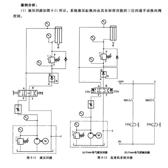 (1)圖8-11中,當Y型三位四通手動閥位于中位時,液控單向閥關閉,由于液控單向閥的密封性很高,可以對液壓缸進行鎖定。即使是在液壓系統(tǒng)出現(xiàn)壓力故障時,液控單向閥仍能使液壓缸活塞桿長期維持原位,重物懸停。