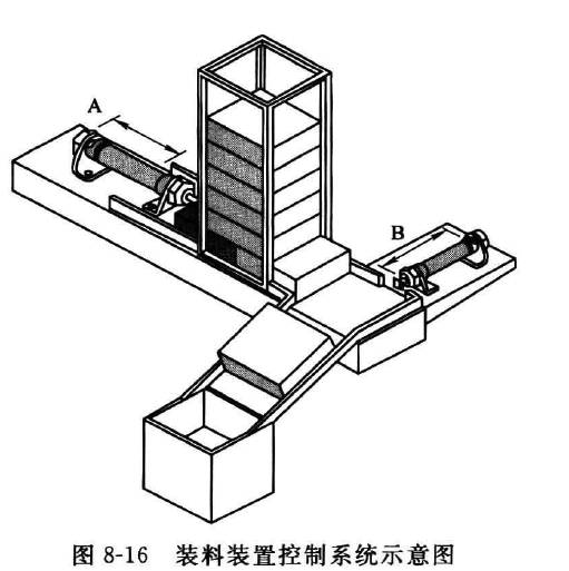 用兩個(gè)氣缸從垂直料倉中取料并向滑槽傳遞工件,完成裝料的過程。如圖8-16所示,要求按下按鈕缸A伸出,將工件從料倉推出至缸B的前面,缸B再伸出將其推人輸送滑槽。缸B活塞伸出將工件推入裝料箱后,缸A活塞退回,退到位后,缸B活塞再退回,完成一次工件傳遞過程。