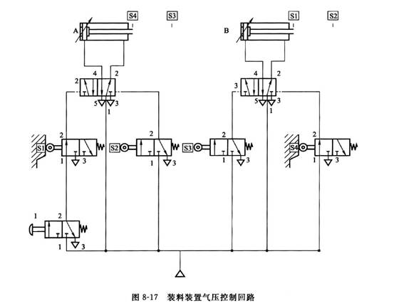 按下啟動(dòng)按鈕1.缸在原位壓下行程閥S1,氣控閥左位工作,缸A伸出,把工件從料倉中推出至缸B前面,缸A壓下行程閥S3,氣控閥3左位工作,缸B伸出,把工件推向滑槽,缸B壓下行程閥S2,氣控閥2右位工作,缸A退回原位,缸A壓下行程閥S4,氣控閥3右位工作,缸B退回原位,缸B壓下行程閥S1,一次工件傳遞過程結(jié)束,開始下一個(gè)循環(huán)。