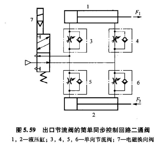 最簡(jiǎn)單的氣缸速度控制方法是采用調(diào)速閥進(jìn)行出口節(jié)流調(diào)速。圖5. 59為.使用出口節(jié)流調(diào)速閥3, 4, 5, 6的簡(jiǎn)單同步控制回路。采用這種同步控制方法,如果氣缸缸徑相對(duì)于負(fù)載足夠大,工作壓力足夠高,則可以取得一定程度的同步效果。此外,在圖5. 59所示回路中,只使用了一只電磁閥7,如果使用兩只電磁閥,使兩只氣缸的給排氣獨(dú)立,相互之間不受影響,則同步控制效果會(huì)便好些。但上述同步方法都不能適應(yīng)負(fù)載F}和凡的變化較大的·場(chǎng)合,即當(dāng)負(fù)載變化時(shí),同步精度要降低。