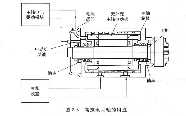 8—3所示的電主軸布局是將電機的轉子直接作為機床的主軸,主軸單元的殼體即是電機座,