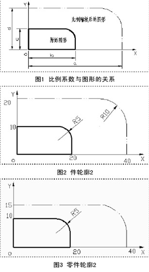 比例縮放功能的編程主要有兩個要素:縮放中心和各坐標(biāo)軸縮放比例如果在G51編程格式中省略了X, Y, Z,則刀具當(dāng)前所處位置為縮放中心。比例系數(shù)與圖形的關(guān)系見圖1,粗實線繪制的是原始零件輪廓,雙點畫線表不以。點為縮放中心,縮放后得到的零件輪廓,其中a/b表}X軸方向的比例系數(shù)、d/c表}Y軸方向的比例系數(shù)