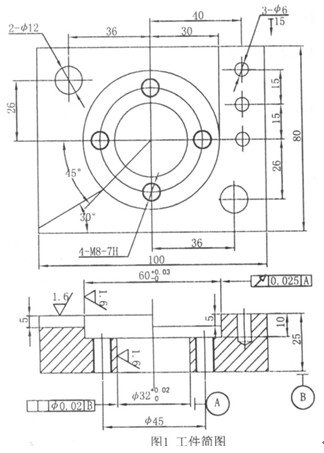 為了培養(yǎng)并訓(xùn)練初學(xué)者對工件的數(shù)控加工工藝分析與設(shè)計(jì)能力 , 提高數(shù)控程序編制的正確率 , 熟練操縱數(shù)控機(jī)床對工件進(jìn)行數(shù)控加工 , 避免在實(shí)際生產(chǎn)加工過程中由于誤操作而引發(fā)的機(jī)器設(shè)備故障、工具損壞、工件報(bào)廢、甚至操作人員的傷亡 , 或是由于設(shè)備種類和數(shù)量的不足、生產(chǎn)條件的限制 , 無法保證每名初學(xué)者對數(shù)控機(jī)床的實(shí)際操作 , 可以采取行之有效的教學(xué)方法 , 即通過使用 “數(shù)控加工仿真系統(tǒng)”, 虛擬現(xiàn)實(shí)技術(shù)和多媒體技術(shù) ,可以讓多數(shù)學(xué)生同時(shí)進(jìn)行大量低成本仿真練習(xí) , 熟練地掌握數(shù)控機(jī)床各種操作規(guī)程與技術(shù)以及手工編程設(shè)計(jì)與調(diào)試能力 , 為實(shí)際操作打下良好基礎(chǔ). 下面就圖 1 所示工件應(yīng)用“數(shù)控加工仿真系統(tǒng)”進(jìn)行數(shù)控編程與加工過程的分析.