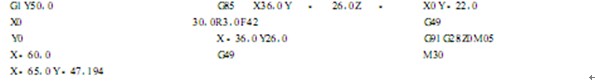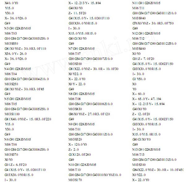 該工件的數(shù)控加工工序可以在加工中心上一次裝夾來完成, 數(shù)控程序嚴(yán)格按照數(shù)控加工工序卡片進(jìn)行編寫. 編程規(guī)則為 FANUC0 系統(tǒng), 程序如下: