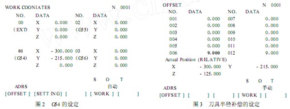 應(yīng)用尋邊器分別對工件的 X、Y 方向進(jìn)行找正 , 設(shè)定工件坐標(biāo)系 G54 的 X、Y 值 , 屏幕顯示結(jié)果如圖 2 所示. 刀具半徑補(bǔ)償與刀具長度補(bǔ)償?shù)脑O(shè)定屏幕顯示結(jié)果如圖 3、圖 4 所示 (注意小數(shù)點(diǎn)和正負(fù)號) .